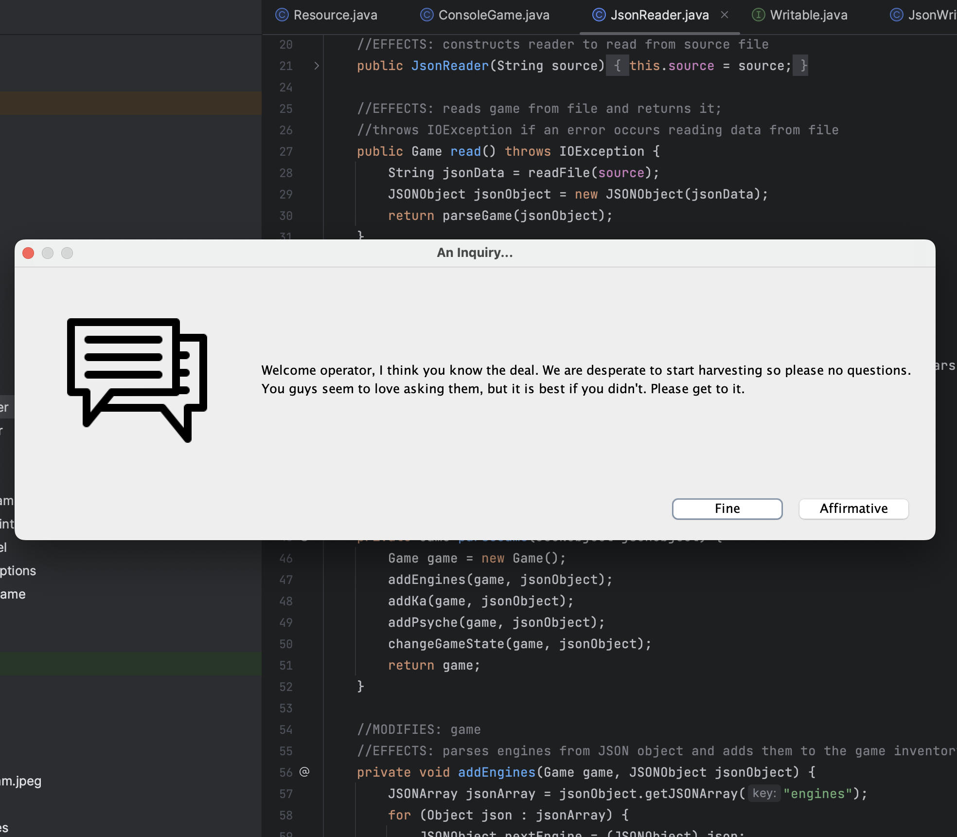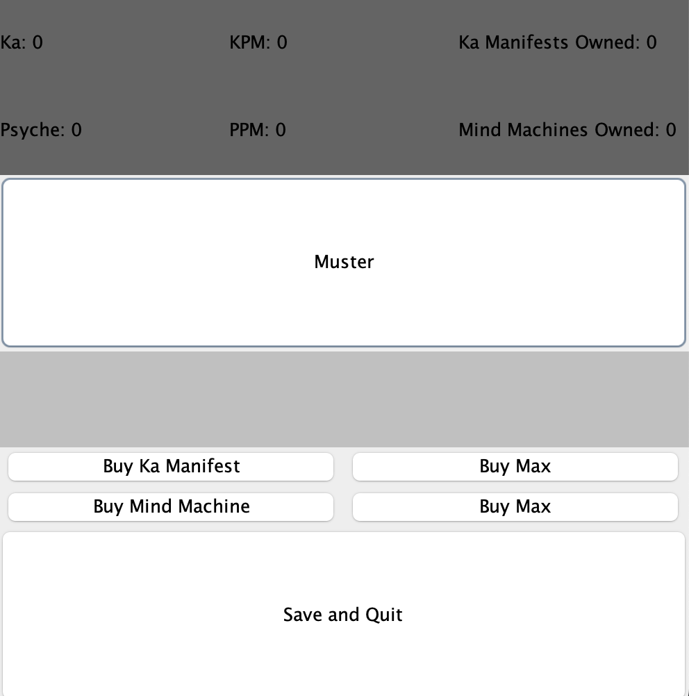 This project was my first foray into the world of Java, produced over the course of a month, concluding in December of 2023. The concept was to create the framework for a clicker game with an emphasis on engine building mechanics and storytelling. The inspiration for this game comes from 2013's A Dark Room, a game I played in the browser when I was 13. A Dark Room initially presents itself as an unassuming clicker game. You are given a button to 'stoke the fire' and as you tend to the fire, you are exposed to more and more of the environment around you. Text readouts give you an apprehension of the scene around you and more buttons appear as you discover uses for more and more resources. You explore all of the resources in your surroundings and continuously push your domain until it takes a small civilization to gather the materials you desire. The game ends with a triumphant space shuttle launch, as any self-respecting civilization requires a space program.